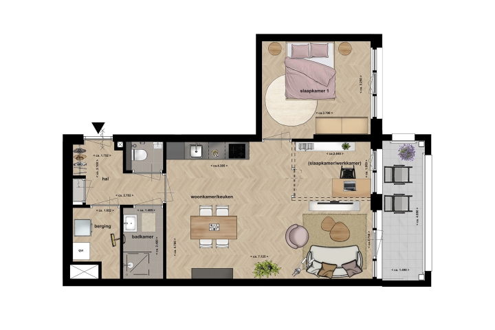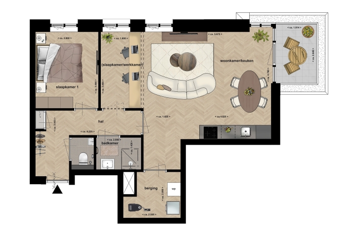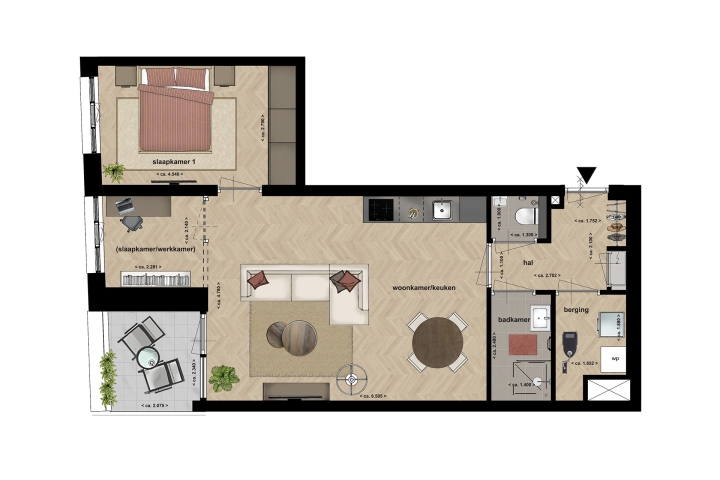 De appartementen variëren van ca. 50 tot 64 m² en beschikken over 2 of 3 kamers (1 of 2 slaapkamers). De indelingen zijn praktisch en slim opgezet, zodat iedere meter goed wordt benut. Of je nu kiest voor compact en efficiënt, een allround woning of juist extra buitenruimte, binnen Via Insulae is er een type dat past bij jouw woonwensen.