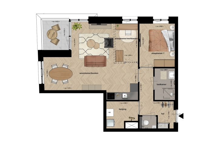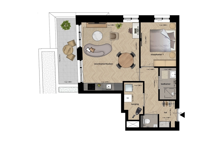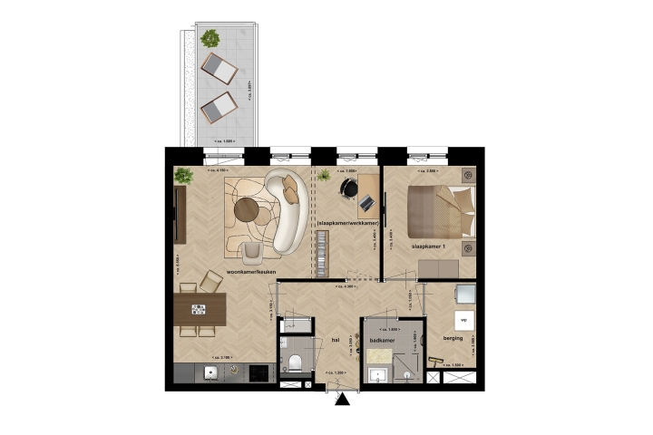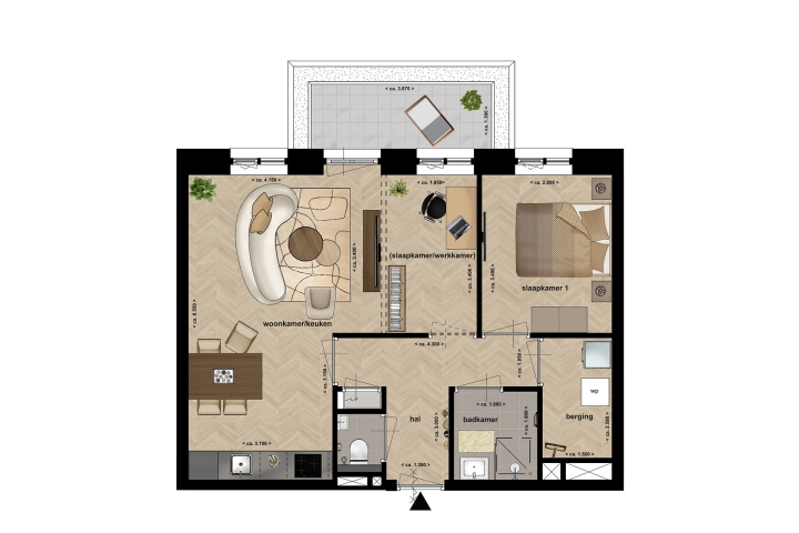 Elke woning heeft een eigen buitenruimte. Van balkons van circa 6 m² tot royale terrassen van maar liefst 15 m² of meer. Zo wordt buiten echt onderdeel van je woonruimte.